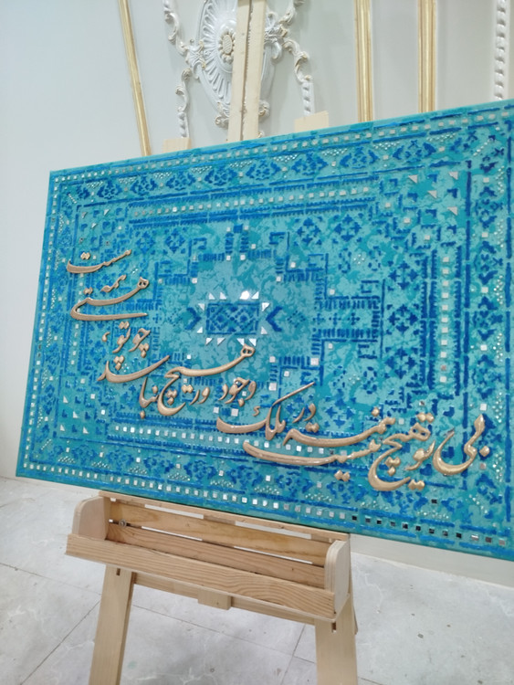 این تابلو طرح گلیم و زمینه پتینه شده قابل در رنگ و تغییر شعر دلخواه را دارد